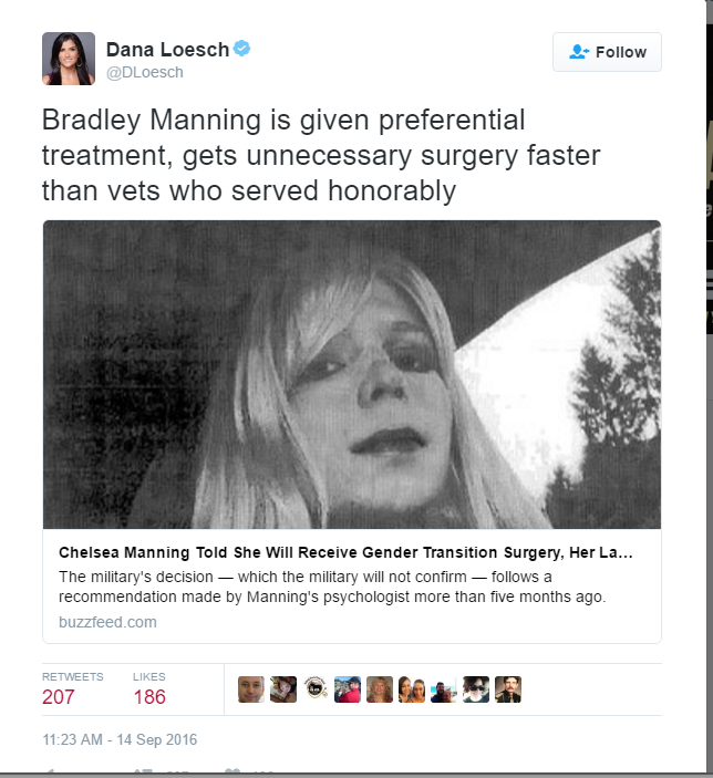 Bradley Manning is given preferential treatment, gets unnecessary surgery faster than vets who served honorably https://t.co/ecReRFqIBS— Dana Loesch (@DLoesch) September 14, 2016